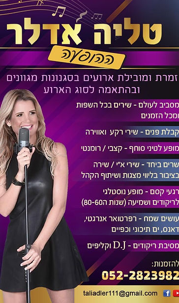 טליה אדלר : תואר שני בחינוך, מטפלת cbt בגישה יצירתית, מורה למוסיקה, זמרת, מורה לפיתוח קול, מנהלת מוסיקלית של להקות זמר וכוריאוגרפית מקצועית. אני מנחת מופעי שירה בציבור, מופיעה מגיל צעיר על במות רבות, כילדה השתתפתי בחמישה פסטיבלי ילדים.